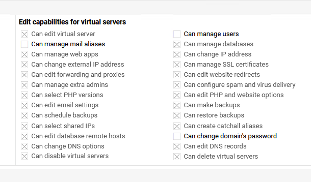 When I create one I have a number of options, including “Can manage extra admins”, nearly all of which have greyed-out Xes over them which cannot be check marked: