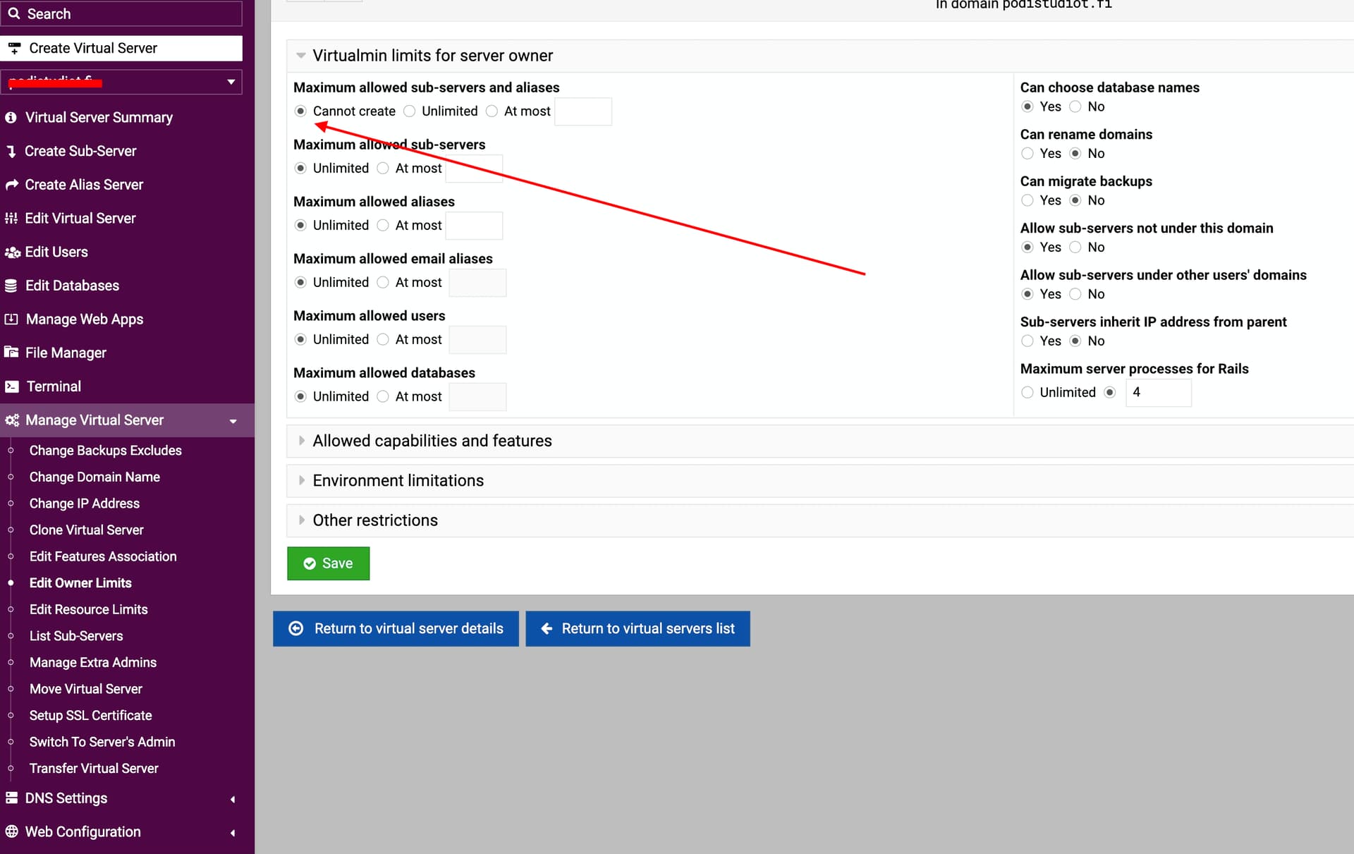Yes, for that one server owner, but I have about 50 of them and I don’t feel like setting their permissions one by one. That’s why I asked, if there’s a global option to prevent any virtual server owner (present or new) from creating sub- and alias-servers on their own.