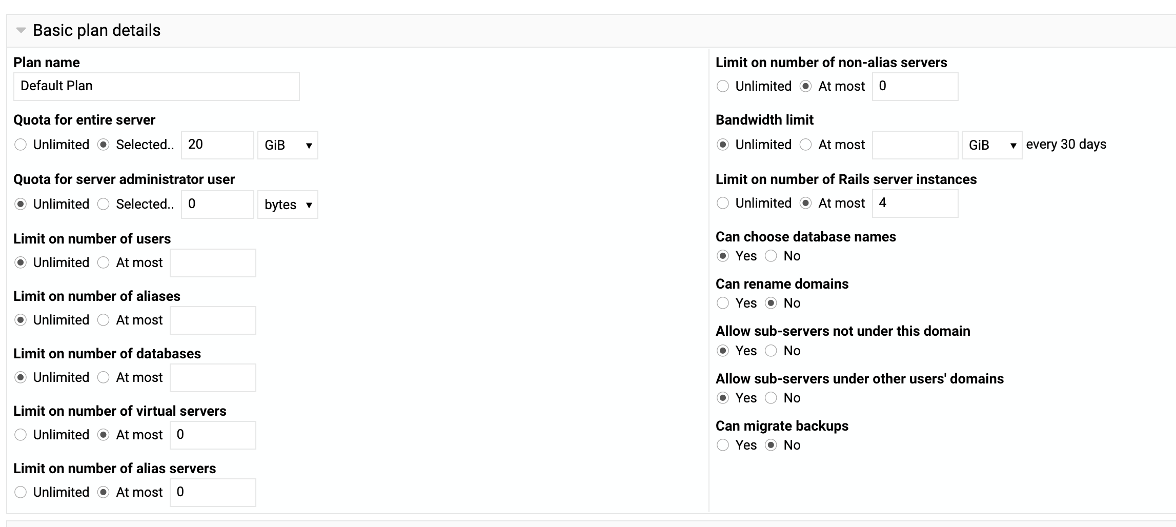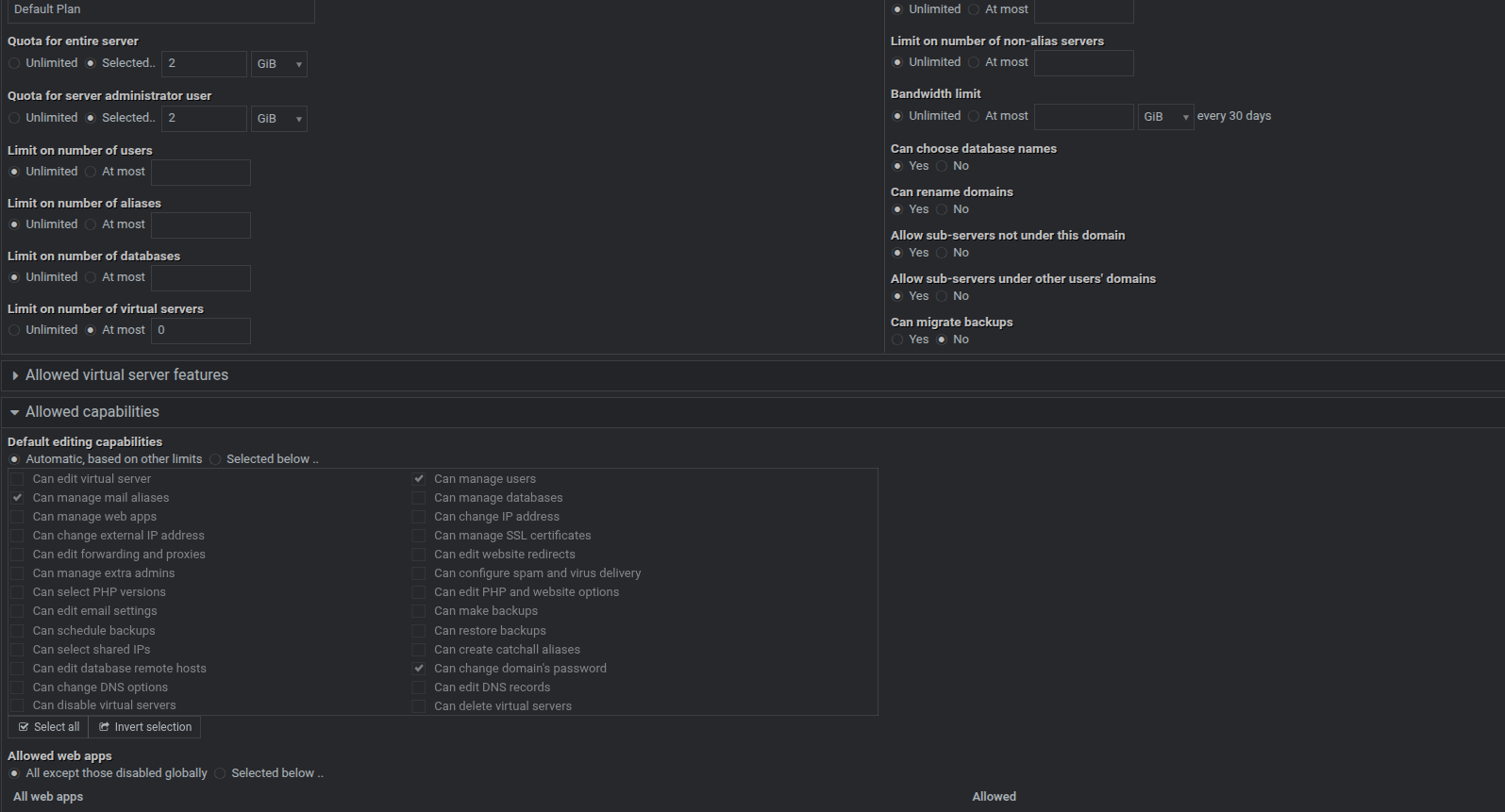 Wait, how did you set that into account plans since there is no option “Cannot create” for Maximum allowed sub-servers and aliases? Or at least I don’t have that option there as shown in my screenshots.
