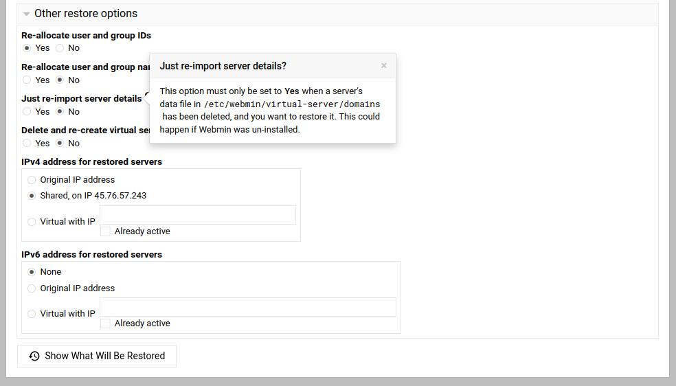 The domain that is missing in Virtualmin will need a slightly different tactic. There is a “fix” feature of restore that just restores Virtualmin metadata. You probably don’t want to alter any features in that one (well, I guess you want the Apache web server configuration).