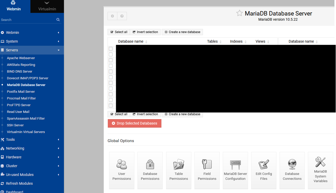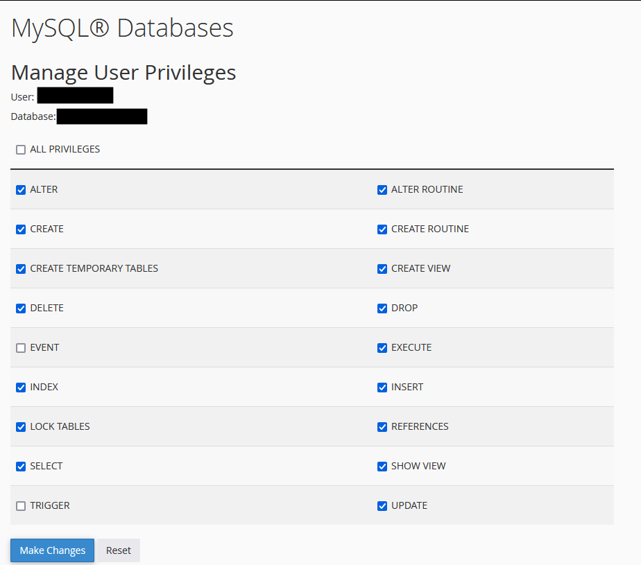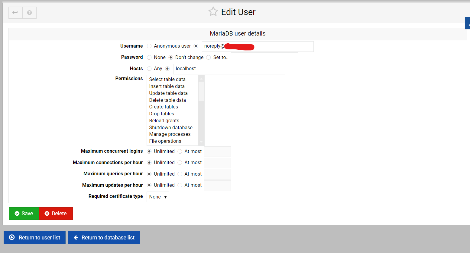 When on the “Edit User” page for “MariaDB user details” you get to choose which permissions are valid for the user.