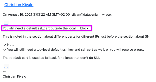 2025-10-02T19:35:26.185272+02:00 host dovecot: imap-login: Error: Failed to initialize SSL server context: Can't load SSL certificate (ssl_cert setting): The certificate is empty: user=<>, rip=1.2.3.4, lip=5.6.7.8, session=<BgYaaTBACuqcm7Fw>