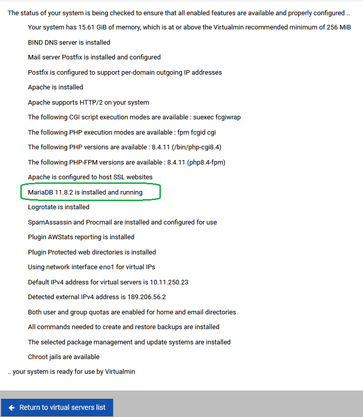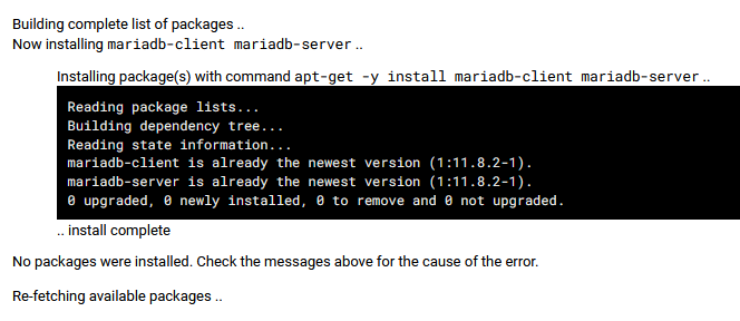 The MariaDB status program package can be automatically installed by Webmin using APT.”