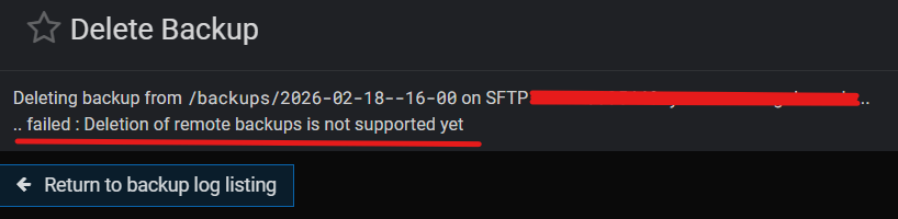 Backup creation to SFTP target succeeds , but automatic deletion does not remove the files from storage. Manual deletion is also not possible (“Deletion of remote backups is not supported yet”).