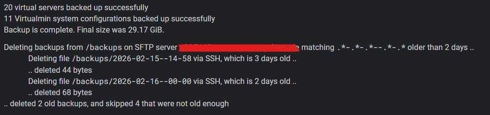 By the way, as the first screenshot at the top indicates, Virtualmin seems to attempt to delete SCHEDULED SFTP backups via SSH already and indicates success (“deleted 44 Bytes”) but the backup actually remains on SFTP storage.