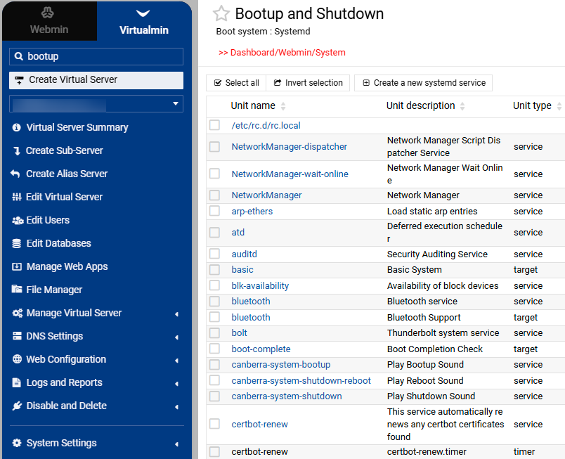 As you searched for the “Bootup and Shutdown” module in the Virtualmin menu, it didn’t open the left menu correctly.