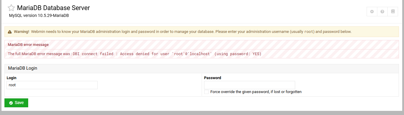 After updating the system with all available updates (it had been about two weeks since the last update), Virtualmin/Webmin are no longer able to connect to the MariaDB database. The same password (the one used by the root user only to connect to MariaDB, and different from the SSH root login password) is still valid for accessing the MySQL root user from the SSH terminal.
