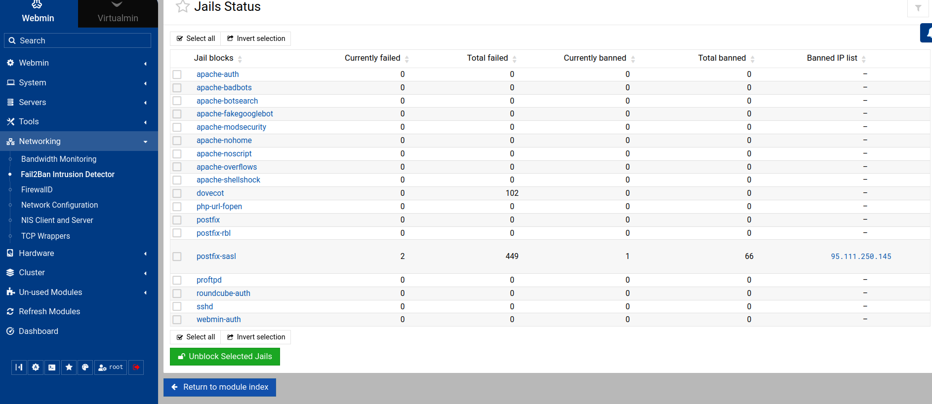 I have activated the following things in Virtualmin: Milter, Spamassassin, Greylisting, Fail2ban and FirewallD, all up and running. My IP’s I am connecting from are not in the Fail2ban jail.