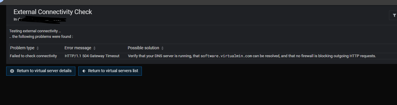 The External Connectivity Check is saying Virtualmin on your system could not reach our server running at software.virtualmin.com, it didn’t even get far enough to check whether your server could be reached from the outside world. No update would cause your network to stop allowing outgoing connections, and no firewall Virtualmin manages or could cause to exist would ever block outgoing traffic. So…seems like a network problem on your network outside of the control of Virtualmin or the Virtualmin server.