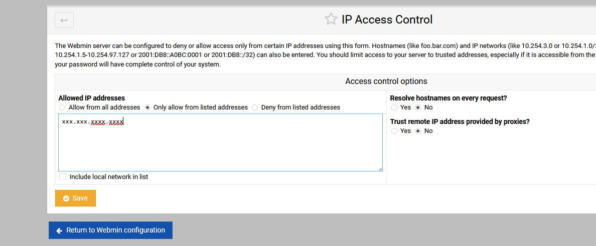 Okay, my beginning issue is that I am locked out of the webmin interface through https://localhost:10000. What should I edit to hopefully fix that? I’m thinking it’s an IP permission problem.