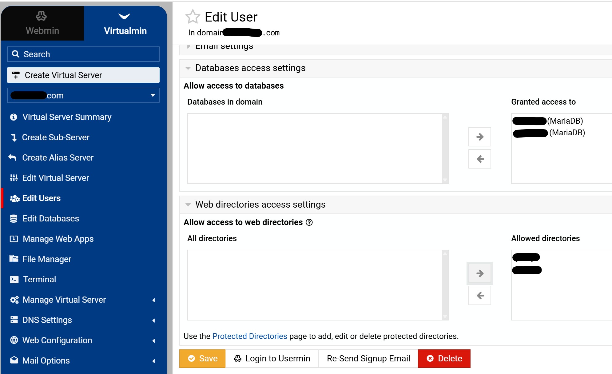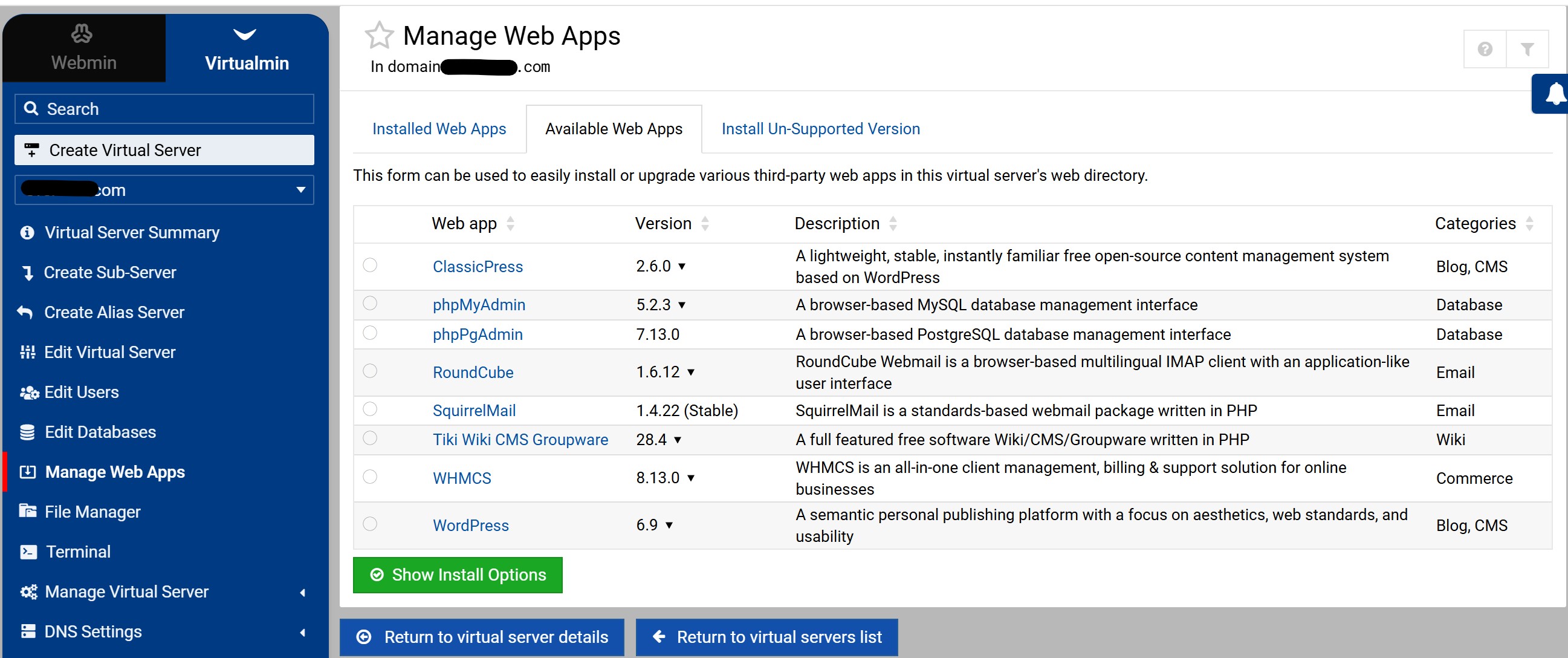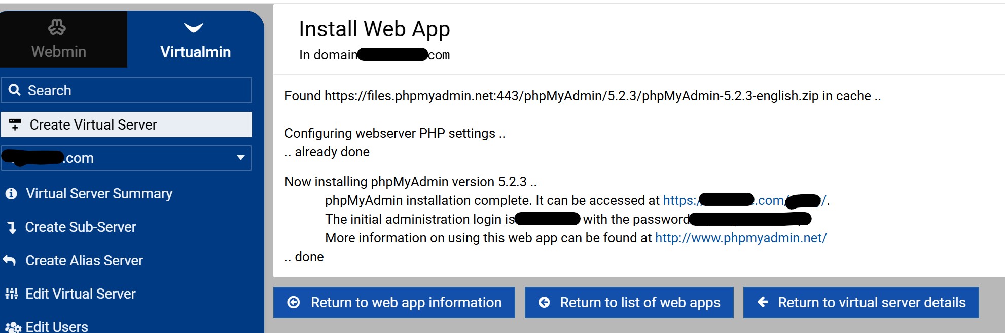 Let’s take the following situation, you have 10 domains hosted on your server. If you install phpMyAdmin in one of them, you will be surprised to find that on that domain, you can access the databases of the other domains (obviously with the username and related passwords). If I remember correctly a long time ago we discussed this in the old forum. But it is not a reason to worry, you can configure phpMyAdmin strictly to work on that domain, but Virtualmin does not do it, you do it manually. This could be an advantage, you can manage all databases with one installation to manage the rest of the domains (pretty close to cPanel).
