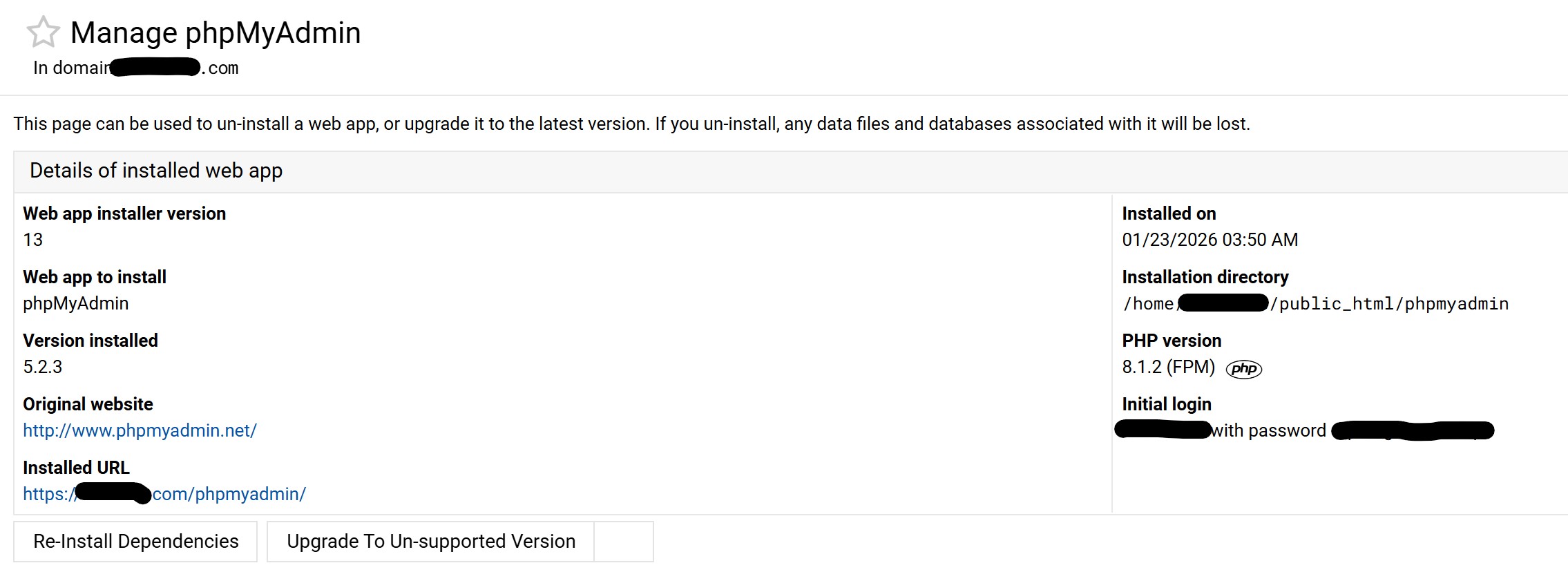 i have it installed now as a ‘web app’ with folder ’ /phpmyadmin’ , but dont see it in any of the public_html folders