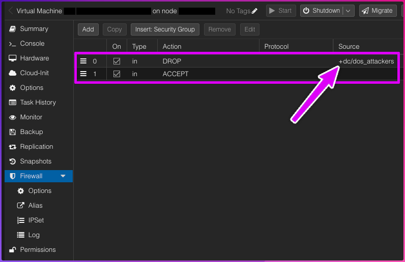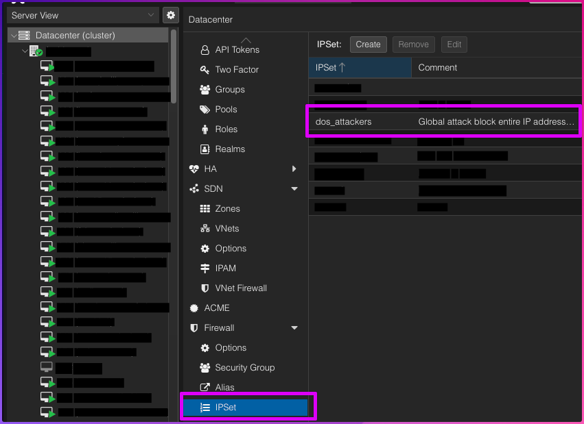 The firewall is stock FirewallD and Fail2ban. But the screenshot below is our life saver for keeping all the machines safe. On each VM we have just two rules, the default accept and a drop tied to an IPSet (master list).