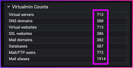 I would like to showcase how incredibly well Virtualmin scales. Here is a server that we’re running for a client. The client has customised their templates when deploying sites to make it perfectly automated. They are current running 386 email domains with Roundcube and SSL, and 772 total email users. Every day they add around 5 to 10 new domains.