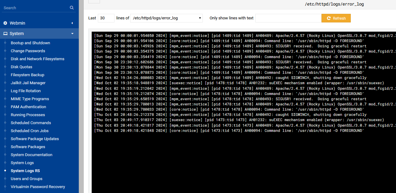 [Fri Oct 04 19:26:03.041179 2024] [mpm_event:notice] [pid 940:tid 140294397999424] AH00489: Apache/2.4.37 (AlmaLinux) OpenSSL/1.1.1k mod_fcgid/2.3.9 configured -- resuming normal operations