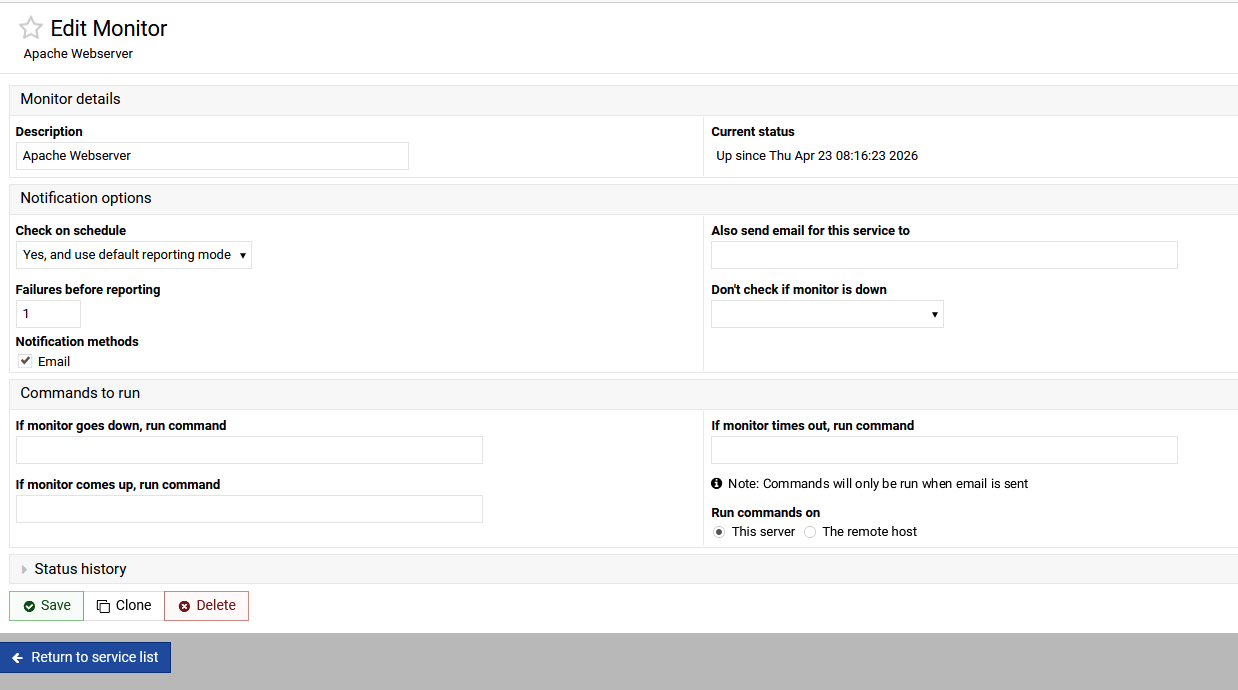 So I can potentially configure a command to restart the service if it fails using If monitor goes down, run command but this requires that I know the command and for each of these services I want this to happen I also need to know the various commands, maybe apache2 restart or restart apache2