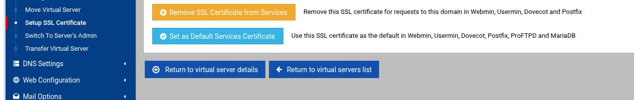 Virtualmin gives you the option of keeping SSL certificates and keys in each virtual server’s home directory, or another location under /etc. The former is easier to manage, but introduces the risk that server owners may cause your webserver to fail to start if they delete the certificate file.