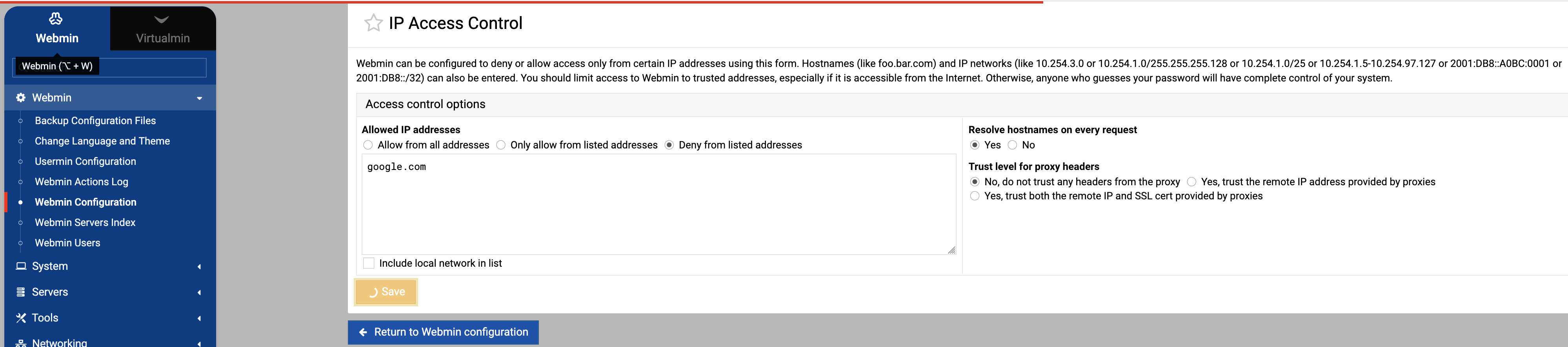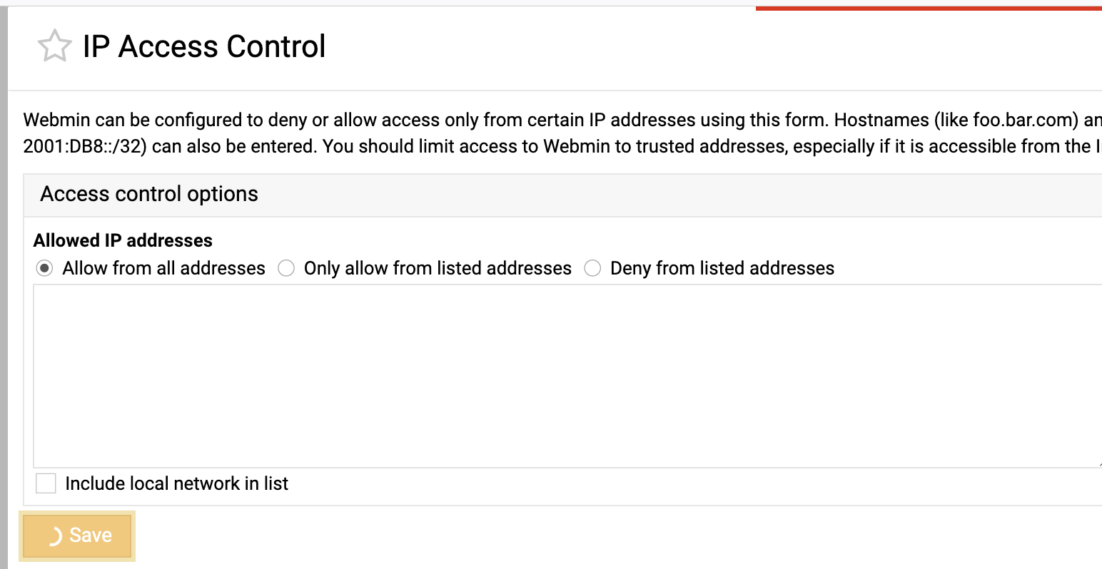 Either way, one can always click on “Return to Webmin configuration” and then re-open the access control, and the changes have been saved.