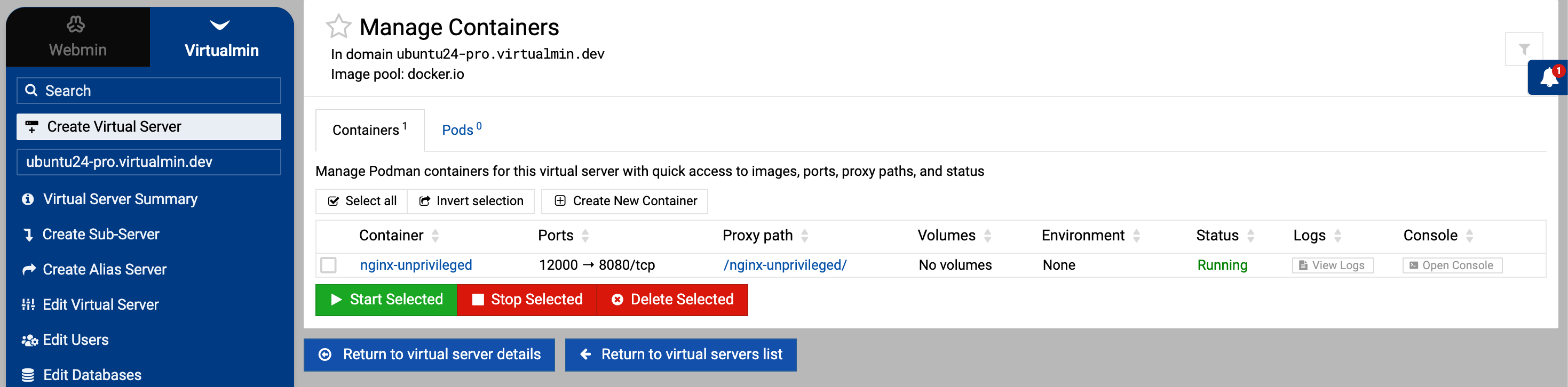 This module adds Podman management to Virtualmin domains and to the global