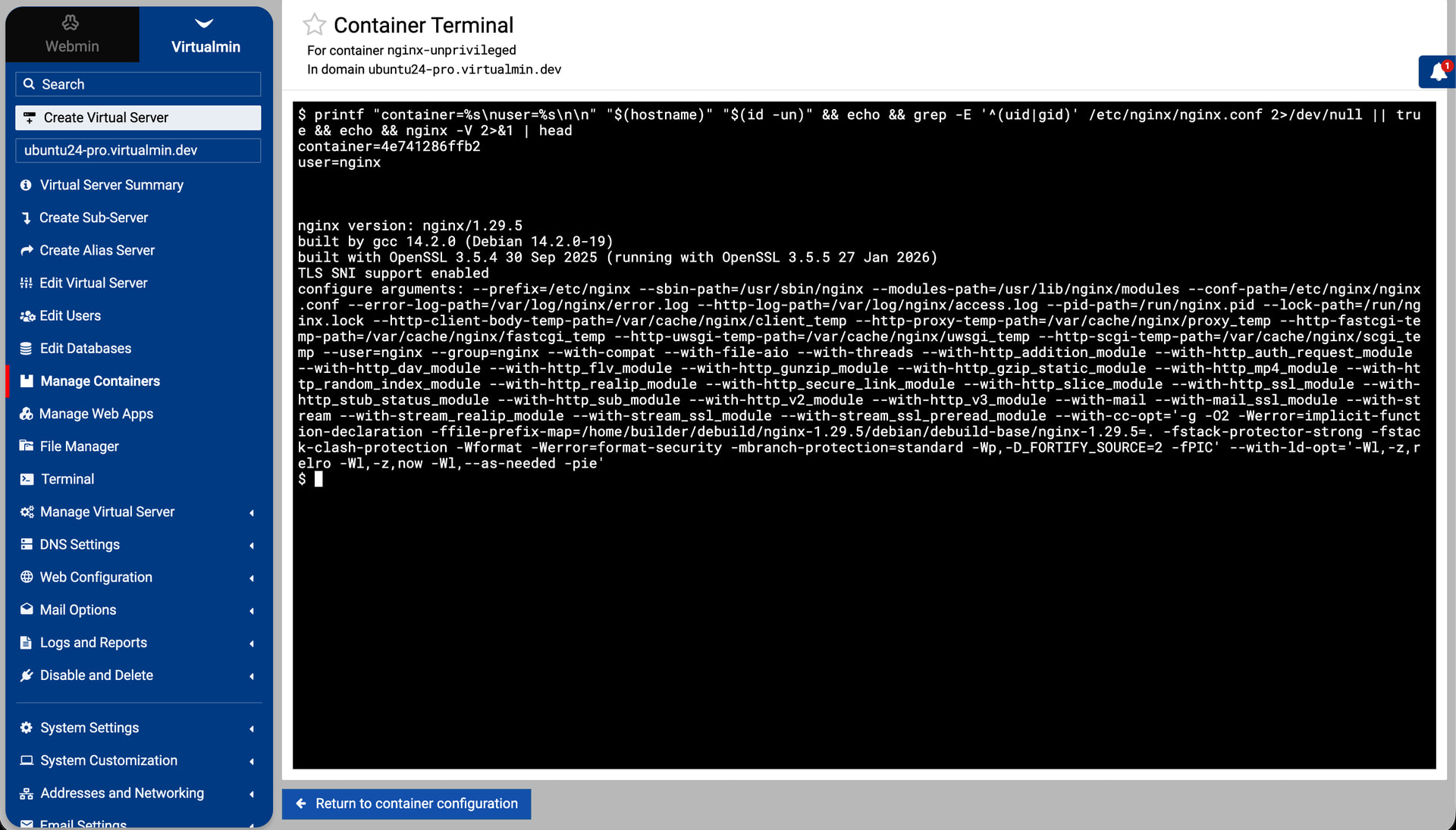 Virtualmin explorer. It supports both container and pod workflows, runtime-