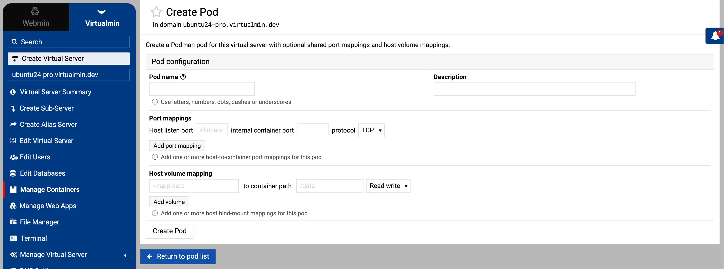 Virtualmin Podman plugin for deploying and managing Podman containers and pods